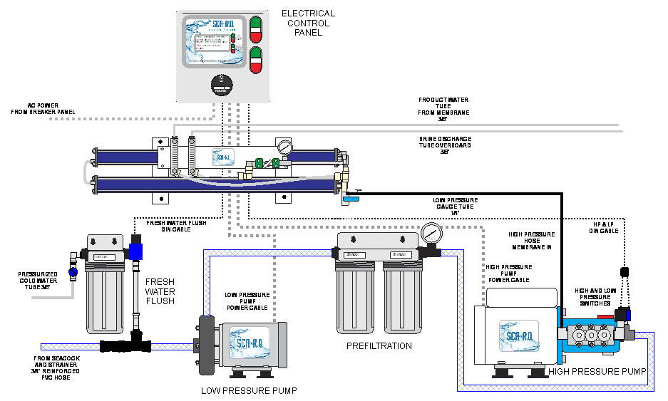 Keeping biomatter from growing on the membrane is really critical to membrane survival. Sea water contains a large amount of biomatter. Just like the bottom of a boat it is looking for a place to grow. Flushing the membrane with fresh or product water after every use is built into most automated machines. The fresh water from your tank does not contain any of the biomatter sea water does and helps retard bio growth. The flush cycle will typically use a couple of gallons of water every flush cycle. Automated machines will have an auto-flush feature and when they are turned ON, the fresh flush will use water from the freshwater tank to flush the membrane typically every 5 days. Some machines can be programed for shorter or longer intervals. It is important to leave on the domestic water system pump on for the auto flush to work. Good practice tells us to turn off the freshwater system when we leave the vessel. I often find the freshwater pump braker in the OFF position. Making the fresh water flush inoperative.