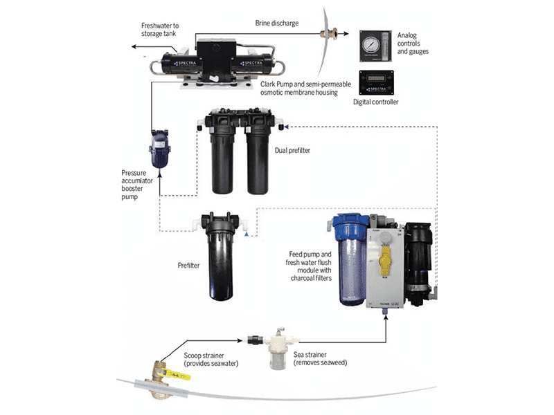 Filters: Keeping the sea stainer clean and filters changed and in good condition is essential to the operation of any water-making machine. Most machines will have a 20-micron and a 5-micron filter. Having a supply of extra filters in good condition is a must. If you plan on any extended trip. If you plan on installing a water-maker an accessible location for the filters is an important consideration. Placing the filters where they can easily drain into the bilge without making a mess is always welcome.